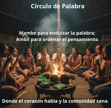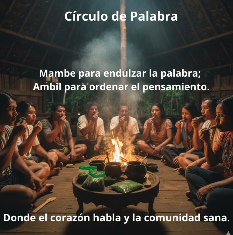 Los Círculos de la Palabra son espacios sagrados donde la dupla de Mambe y Ambil actúa como un puente para la conexión profunda y la sanación comunitaria. Al unir la "palabra dulce" del Mambe con el "pensamiento ordenado" del Ambil, se abre un portal para expresar verdades desde el corazón, resolver conflictos con sabiduría y tejer lazos de unidad. Esta práctica ancestral beneficia al ser humano al clarificar la mente, nutrir el espíritu y fortalecer los lazos sociales, cultivando la empatía y el respeto mutuo. Pero su poder no se limita a lo colectivo: también puedes crear tu propio "mambeadero personal" en casa. A solas, Mambe y Ambil te guían en una profunda introspección, ayudándote a conectar con tu sabiduría interna, a ordenar tus pensamientos, aclarar tus metas y encontrar la paz necesaria para navegar tu día a día con conciencia y propósito. Es un ritual flexible: ya sea en la compañía de otros o en la intimidad de tu ser, siempre será una herramienta de auto-conocimiento y armonización.